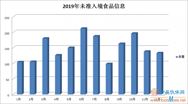 按月統(tǒng)計(jì)發(fā)現(xiàn),6月、10月、7月、3月未準(zhǔn)入境食品數(shù)量居多,分別有212批次、196批次、187批次、180批次。具體每月未準(zhǔn)入境食品數(shù)量見(jiàn)下圖: